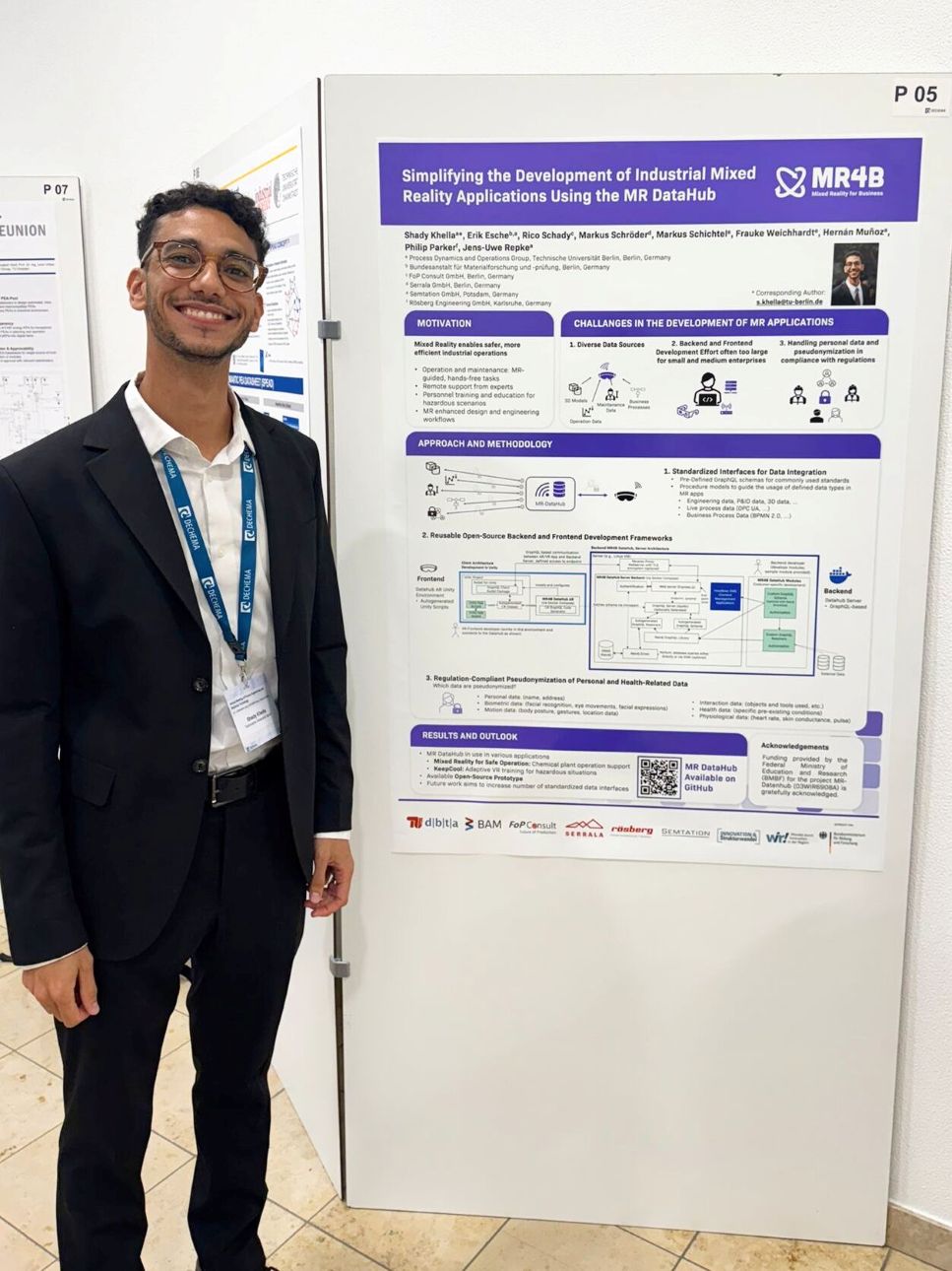 Ergänzend veranschaulichte das Poster „Simplifying the Development of Industrial Mixed Reality Applications Using the MR DataHub“, wie eine flexible API-Plattform die Entwicklung industrieller MR-Anwendungen beschleunigt. Das Poster war eine Gemeinschaftsarbeit von Shady Khella (TU Berlin), Erik Esche (BAM), Rico Schady (FoP Consult), Philip Parker (Rösberg Engineering), Hernán Muñoz (TU Berlin), Jens-Uwe Repke (TU Berlin, Fachgebiets Dynamik und Betrieb technischer Anlagen), Markus Schröder (Serrala), Frauke Weichhardt und Markus Schichtel (Semtation) und wurde mit dem Best Poster Award ausgezeichnet!