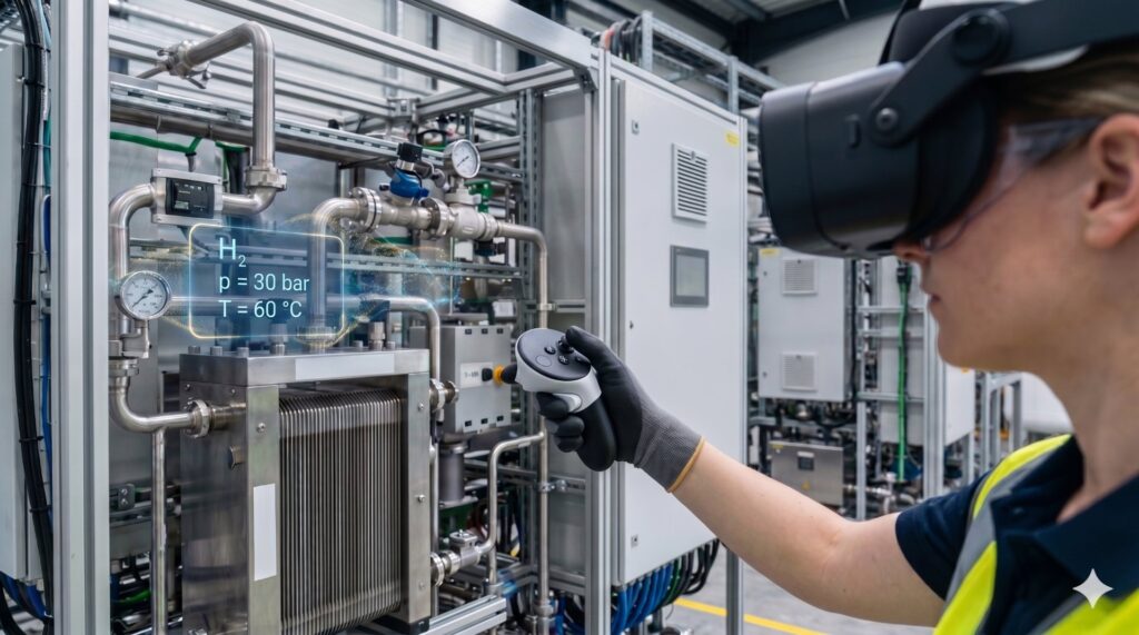 Methoden zu Planung, Betrieb und Wartung von Wasserstoffanlagen, wobei MR und MTP parallele Konzeptentwicklung, Personaltraining, Fehlererkennung und flexible Planung ermöglichen.
